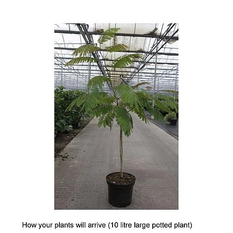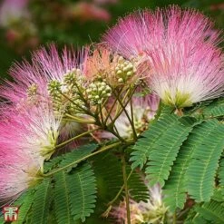 Grown as either a shrub or small tree, Albizia julibrissin ‘Ombrella’ is large and deciduous with a rounded habit. Dark green, fern-like leaves are divided into sickle-shaped leaflets, with spherical, fluffy, fragrant, bright pink flowers from mid-summer through to early autumn. Height: 5m (16′). Spread: 2m (6.5′).