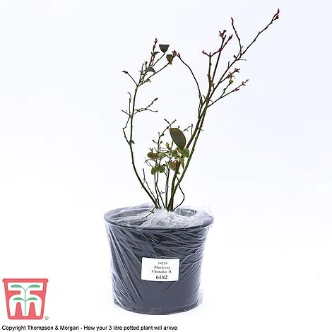 Blueberry ‘Chandler’ produces a wealth of juicy fruit that are simply bursting with the most delicious flavour. Enormous, firm berries weighing up to 2g and measuring 20mm (¾inch) in diameter are produced from the beginning of August until mid September. This stout blueberry bush also makes an attractive shrub for the patio or acidic borders, bearing masses of sweetly scented creamy white flowers in spring, and fiery crimson autumn foliage. Blueberries are packed with health-boosting compounds and are especially delicious in pies, muffins and jams. Height and spread: 150cm (59″).