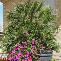 The Dwarf Fan Palm, Chamerops humilis, is possibly one of the hardiest evergreen palm trees available. As the name suggests, its fan shaped leaves are produced on short, robust looking trunks and will definitely add an exotic feel to any garden. Slow growing and tough, this variety is ideal for container growing and will also produce clusters of yellow flowers in the summer to give an extra display and add yet further interest. Height: 200cm (78″). Spread: 150cm (59″).