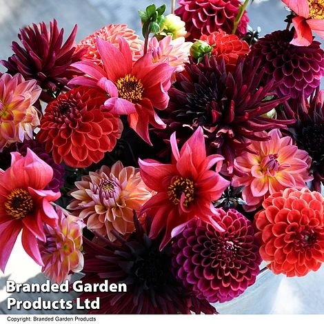 Enjoy this sumptuous mix of autumnal shades balancing vibrant coral pinks against deep maroons. Contrasting flower shapes add interest, with the spiky silhouette of cactus dahlia set against the spherical heads of pompon varieties. Chosen for their free flowering nature and versatility, these dahlias will pump out flowers from midsummer to the first frosts and are equally suited to borders or containers. All of them feature sturdy, branching stems giving you armfuls of flowers for long-lasting indoor displays.