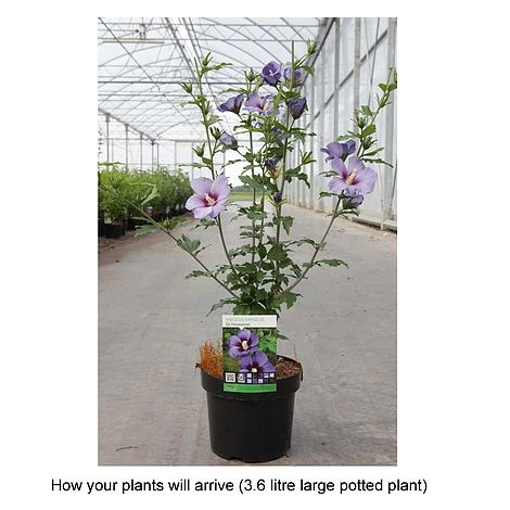 Tight, upright stature, together with a fast growing habit makes this lavender-blue hibiscus one of the best blue varieties on the market. The flowers are fairly large and have a deep maroon blotch painted on the base of each petal, giving the overall colouring a bit of depth. Hibiscus syriacus Ultramarine ‘Minultra’ is a hardy, deciduous shrub which completes the colour range presented by other hibiscus varieties. Height: 3m (10′). Spread: 2m (6.5′).