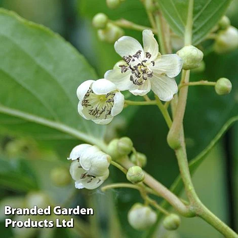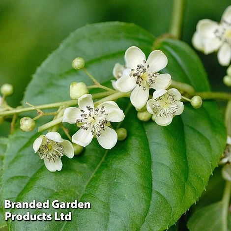 The perfect match for ‘Pink Jumbo’, ‘Prince Jumbo’ is a non-fruiting vigorous male clone that serves as an indispensable pollinator for all Actinidia arguta varieties. Creamy-white flowers are produced prolifically and reliably in June on a fast-growing vine which can easily be kept compact with pruning. Height and spread: up to 8 metres (26ft).
