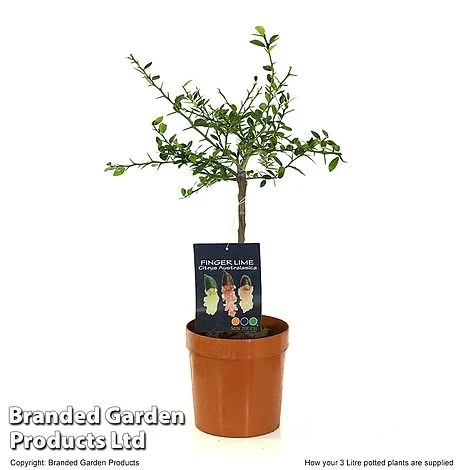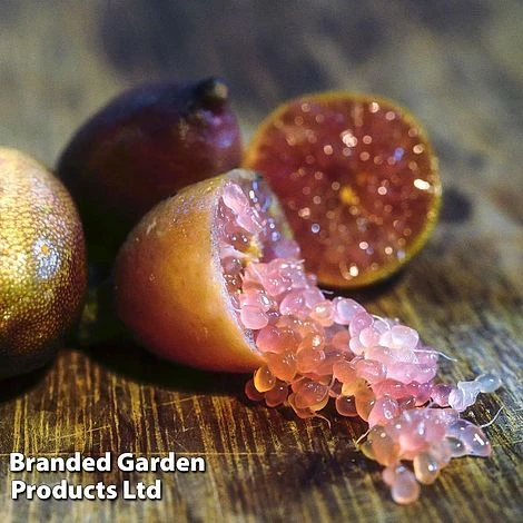 Rapidly gaining popularity as gourmet bush tucker, Caviar Lime or Citrus australasica, is a thorny evergreen shrub or small tree. White spring flowers are followed by dark green slender pods which turn to pink as they ripen. Inside the pods are pink ‘pearls’, like pomegranate seeds. These pearls or ‘Lime Caviar’ pop in the mouth with an intense citrus fizz which is a cross between lime and grapefruit. The Lime Caviar can be eaten straight off the tree or used to make pickles, marmalades, desserts and as an unusual addition to drinks. Citrus australasica is self-fertile and should be grown in the same way as other citrus fruits. Height: 300cm (10 feet). Spread: 250cm (8 feet).