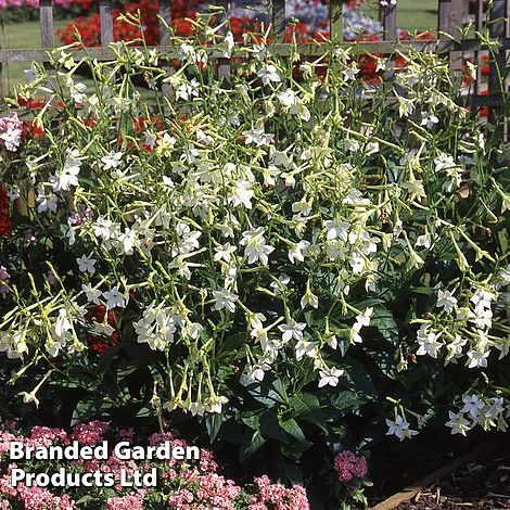 A much-loved bedding plant for over a century, Nicotiana alata bears abundant trumpet-shaped white flowers all the way from June until the first frosts. These elegant blooms have a sweet perfume which intensifies in the evening, making tobacco plant a perfect choice for planting in pots or beds around patios and seating areas where the heady scent can be enjoyed to the full. Tobacco flowers are held in clusters on tall, robust stems and make a great cut flower, with picking prolonging the flowering season. This South American beauty is incredibly low maintenance and provides a valuable source of nectar for butterflies and night-flying moths. A must-have for any patio or cottage garden! Height: 90cm (25in). Spread: 30cm (12in).