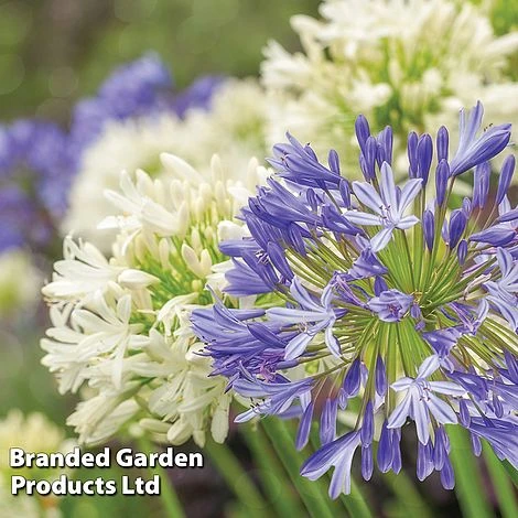- Agapanthus Blue & White Collection (6 bare root plants) – This magnificent mix combines blue Agapanthus ‘Queen of the Ocean’ and white Agapanthus ‘Polar Ice’ for a striking two tone display. In summer, these impressive perennials lend their stature to borders and patio containers, where their architectural seed heads continue the display well into autumn. The large spherical blooms are also magnificent in cut flower displays. Hardy in many parts of the UK, where good drainage and protective winter mulch is provided. Height: 120cm (47″). Spread: 60cm (24″).