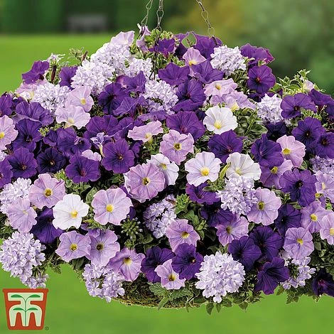 Collection contains: Petunia ‘Veranda Dark Blue’. Petunia ‘Veranda Sky Blue’ and Verbena ‘Voodoo Lavender Star’. Height: 25cm (10″). Spread: 45cm (18″).